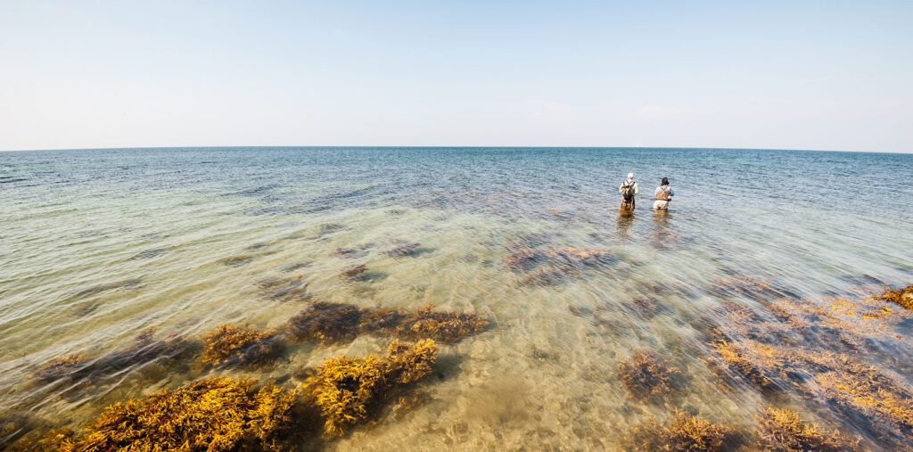 I have personally drawn this comparison over the years, observing how sea trout move across the flats with the same ghostlike subtlety as bonefish. Through my presentations, articles, and talks abroad, this analogy has become central to explaining the uniqueness of this fishery. It still amazes me that in northern Europe, in an environment so different from the tropics, one can find a fishery that brings the angler into the sea, wading slowly among crabs, seagrass, and small baitfish while scanning for the faint shadows of cruising trout. In summer, when the light is high and the sea turns transparent, the resemblance becomes even more striking. Trout can even take flies on the surface, rising delicately like trout on a river or slashing aggressively like tropical predators. Although sight-fishing can be extraordinary, most of the time the angler fishes by blind-casting and covering as much water as possible, searching for cruising fish.