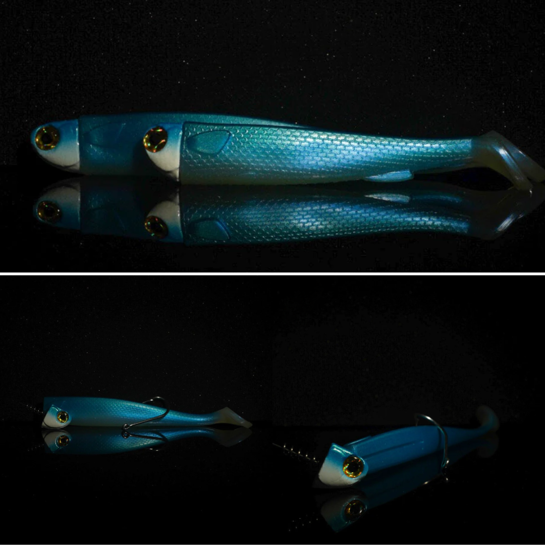 The R&R Tackle Blue Herring Small Batch Slide Baits are expertly crafted to replicate the natural shine and movement of live bait, delivering an incredibly lifelike swimming action in any condition. Their sleek, balanced profile glides smoothly through the water, enticing strikes from a variety of species. Additionally, these baits are designed with the innovative "line through system". This system allows the lure to slide up the leader when the fish runs or jumps which reduces the risk of the hook being thrown and increases the life of the soft tail. Available in 6” and 8” sizes with multiple head weights and options for rigged or replacement tails, these baits adapt easily to different depths and techniques. Produced in small batches for unmatched detail, color, and durability, each one embodies R&R Tackle’s signature handcrafted quality.