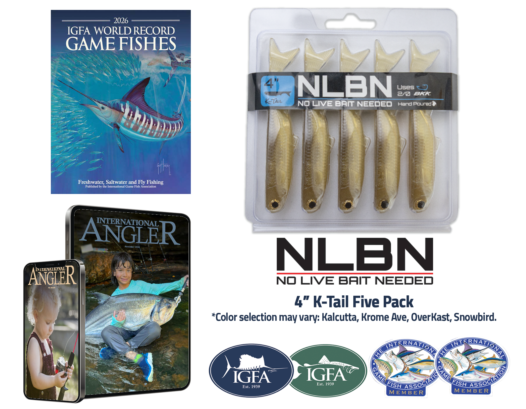 Available to anyone 16 and under. Junior members receive all of the Digital Membership benefits, a mailed copy of the World Record Game Fishes book, IGFA logo decals, PLUS - while supplies last - a NLBN (No Live Bait Needed) 4″ K-Tail Five Pack!