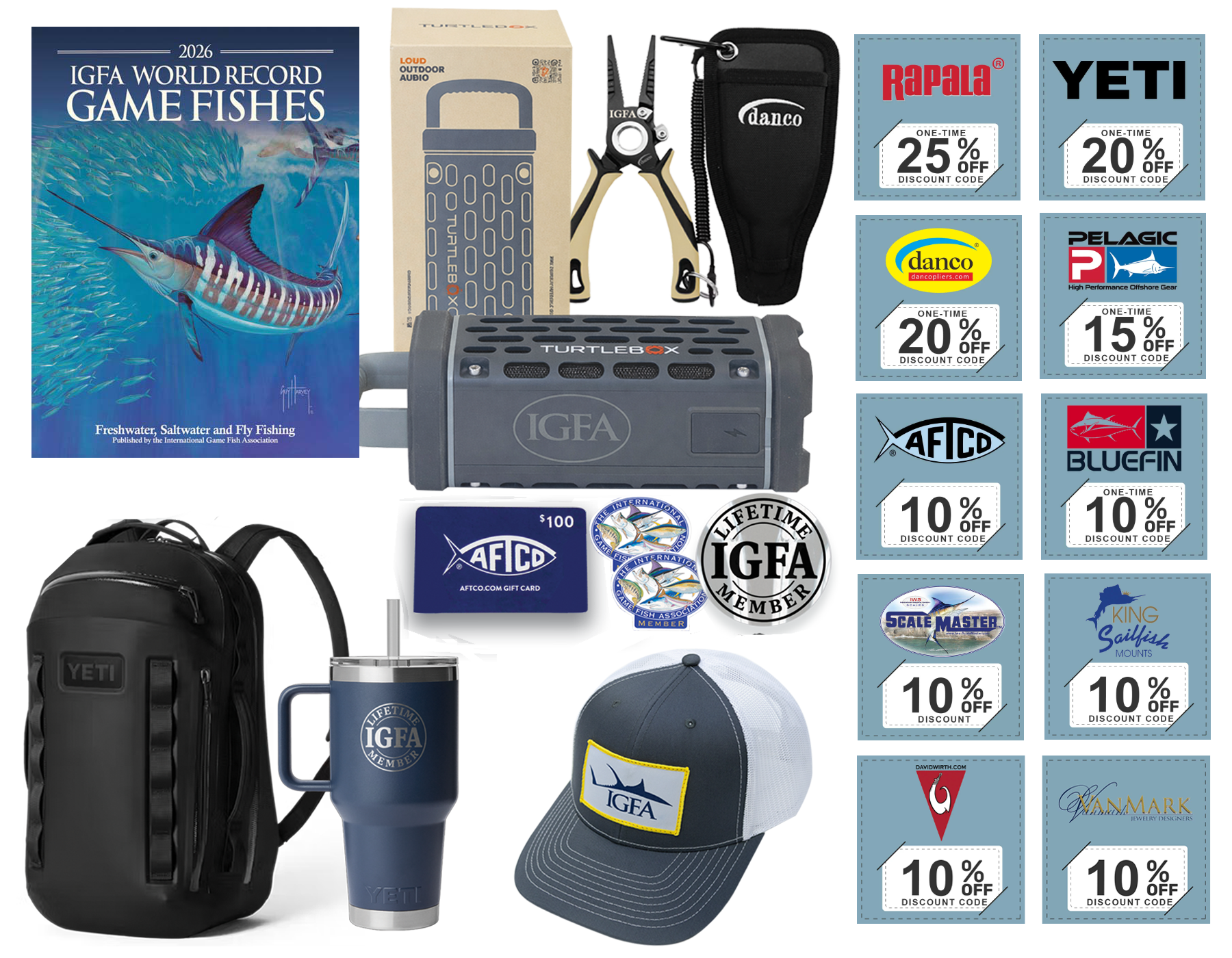 IGFA’s most coveted membership, the IGFA Lifetime Membership, earns you IGFA Member status for life and includes the annual IGFA World Record Game Fishes book mailed to your door each year. For a limited time, new IGFA Lifetime Members will also receive these benefits*: YETI Cayo 25L backpack in black | YETI 35 oz Rambler in navy | Turtlebox Ranger in gray | AFTCO $100 gift card | 7.5” danco Pro Series IGFA pliers | IGFA tuna logo hat