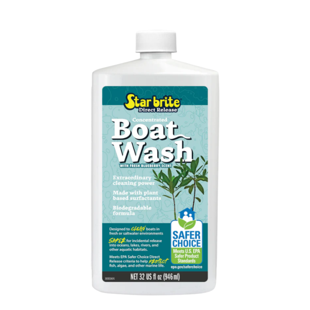 Star brite Direct Release Boat Wash is a concentrated, plant-based cleaner formulated for in-water and dockside use and certified under the U.S. EPA Safer Choice Program. Its biodegradable surfactants cut through dirt, grime, and salt buildup while helping preserve finishes on fiberglass, vinyl, metal, and painted surfaces in both fresh and saltwater environments. For use, mix two capfuls per gallon of water for light cleaning or four capfuls per gallon for tougher jobs, apply with a cloth, sponge, or deck brush, scrub as needed, then rinse and dry to prevent water spots. Finished with a fresh blueberry scent, it’s a smarter, eco-conscious way to keep your boat clean and ready to go.