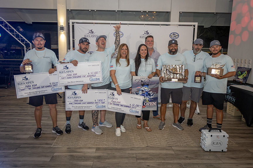 The second annual IGFA Open at Marina Pez Vela, Quepos, Costa Rica, picked up right where last year's event left off with more than 1,200 fish caught and released! After an intense competition, Team Pura Vida claimed the top spot with 7,600 points and an incredible 38 fish on day one alone. Captained by Rudy Arguedas, Team Pura Vida's anglers, Aileen Gonzalez, JC Gonzalez, Ericka Sandi, Sebastian Delgado, Armando Delgado, and Evan Alonso finished the tournament with a total of 72 sailfish and 1 blue marlin to claim the top spot.