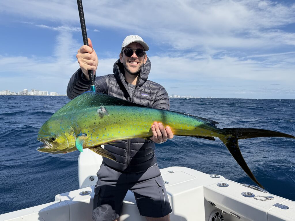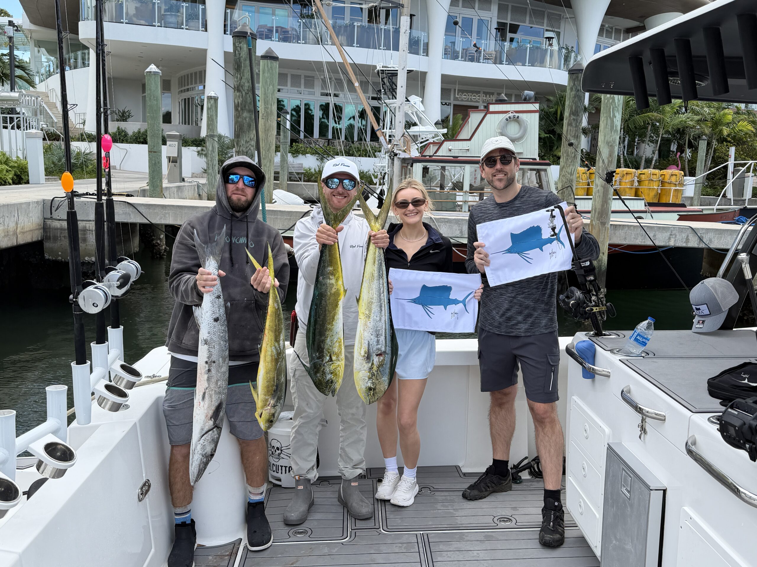 With a stiff NE wind, Capt. Matt Gittelman steered the HammerCatch north out of Port Everglades Inlet after students attending the class departed Pier Sixty-Six Marina, where he had some blackfin tuna bites the day before. They set up in about 200 feet of water and had some good life with birds and packs of flying fish being put up. They were able to fish both kites with ease, as well as three flat lines with a mix of goggle eyes and threadfins. It didn’t take long before Charlie Walsh was tight on a nice 10-lb dolphin(mahi-mahi) that ate a goggle eye out of the kite. Capt. Matt made a move just south of the inlet to finish up the trip and set up on a nice drift, taking them from 170 to 110 feet of water, which resulted in a flurry of bites! Once the dust had settled, both Charlie and Emilie Walsh had each released their first sailfish and added some more dolphin and a barracuda to the mix. Not bad for their first time fishing in the salt!